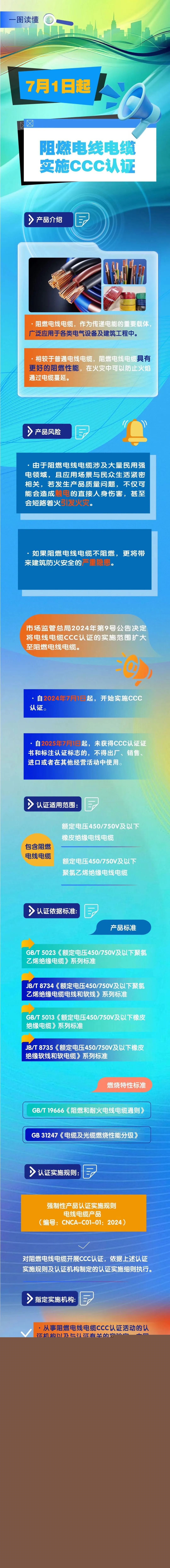 根據市場監管總局2024年第9號公告,自2024年7月1日起,對阻燃電線電纜實施強制性產品認證管理。自2025年7月1日起,未獲得CCC認證證書和標注認證標志的阻燃電線電纜,不得出廠、銷售、進口或者在其他經營活動中使用。